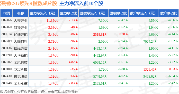 资金流向方面,深指ESG领先R(470029)指数成份股当日主力资金净流出合计208.98亿元,游资资金净流入合计62.64亿元,散户资金净流入合计146.34亿元。成份股资金流向详情见下表: