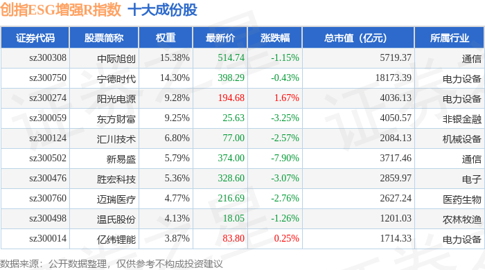 创指ESG增强R(470034)指数十大成份股详情如下: