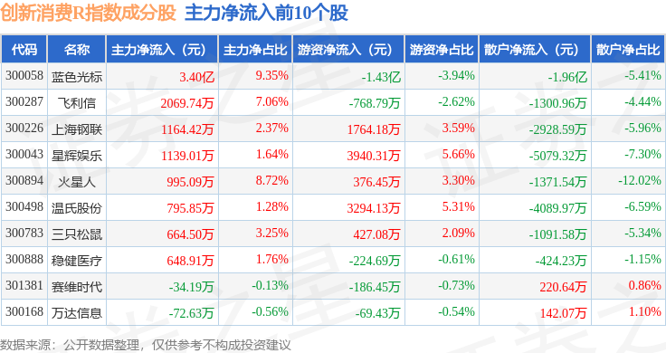 资金流向方面,创新消费R(470041)指数成份股当日主力资金净流出合计9.44亿元,游资资金净流入合计2.44亿元,散户资金净流入合计7.0亿元。成份股资金流向详情见下表: