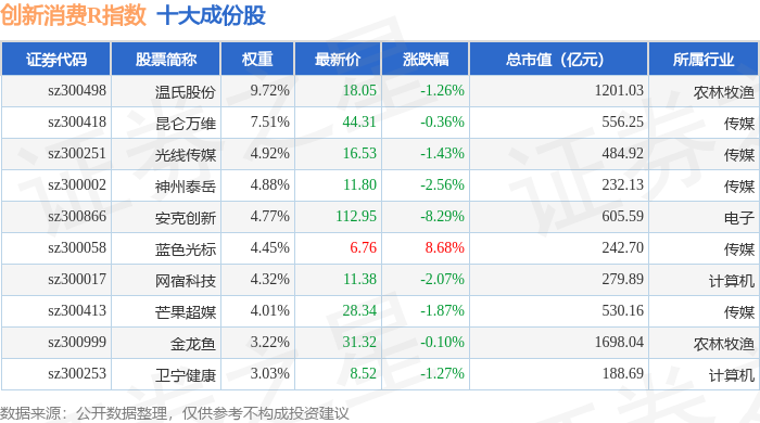 证券之星消息,10月30日,创新消费R(470041)指数报收于2637.5点,跌1.42%,成交267.68亿元,换手率3.68%。当日该指数成份股中,上涨的有8家,蓝色光标以8.68%的涨幅领涨,下跌的有42家,水羊股份以10.25%的跌幅领跌。