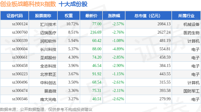创业板战略科技R(471004)指数十大成份股详情如下: