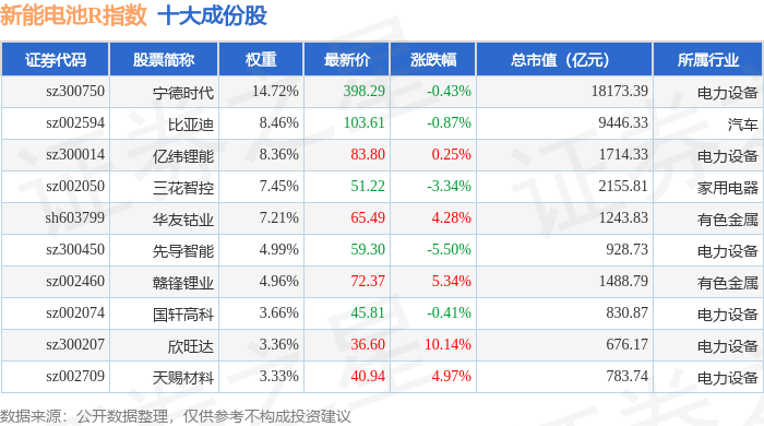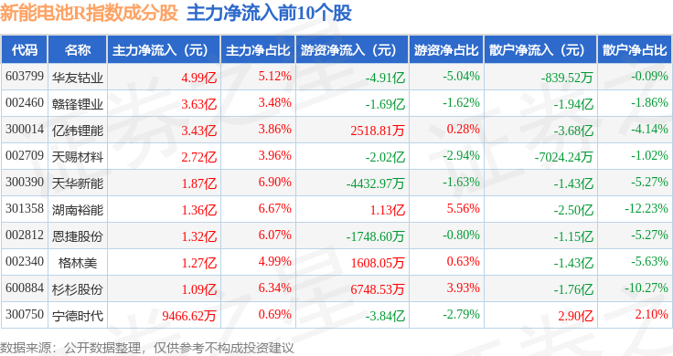 资金流向方面,新能电池R(480032)指数成份股当日主力资金净流出合计22.41亿元,游资资金净流入合计3.15亿元,散户资金净流入合计19.26亿元。成份股资金流向详情见下表: