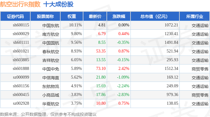 航空出行R(480059)指数十大成份股详情如下: