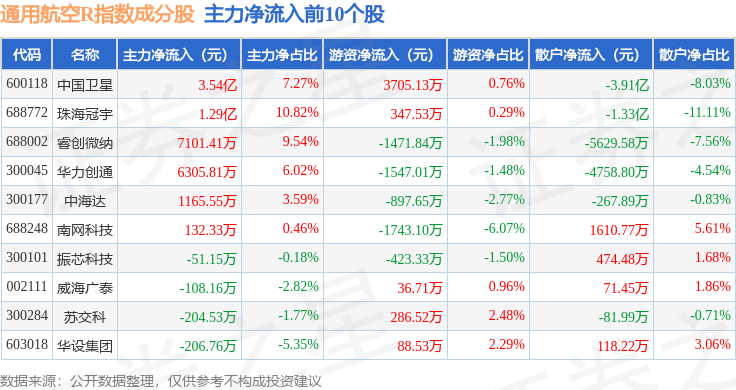 资金流向方面,通用航空R(480076)指数成份股当日主力资金净流出合计9.58亿元,游资资金净流入合计5.43亿元,散户资金净流入合计4.15亿元。成份股资金流向详情见下表: