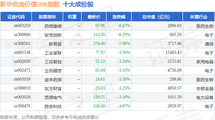 新华优选价值50R(489004)指数十大成份股详情如下: