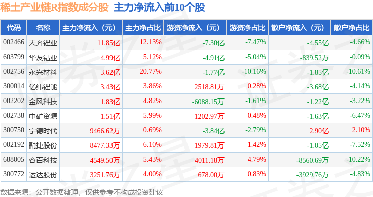资金流向方面,稀土产业链R(489013)指数成份股当日主力资金净流出合计19.35亿元,游资资金净流出合计1893.5万元,散户资金净流入合计19.54亿元。成份股资金流向详情见下表: