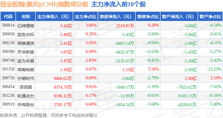 资金流向方面,创业板指(美元)(CNH)(970007)指数成份股当日主力资金净流出合计213.15亿元,游资资金净流入合计87.52亿元,散户资金净流入合计125.63亿元。成份股资金流向详情见下表: