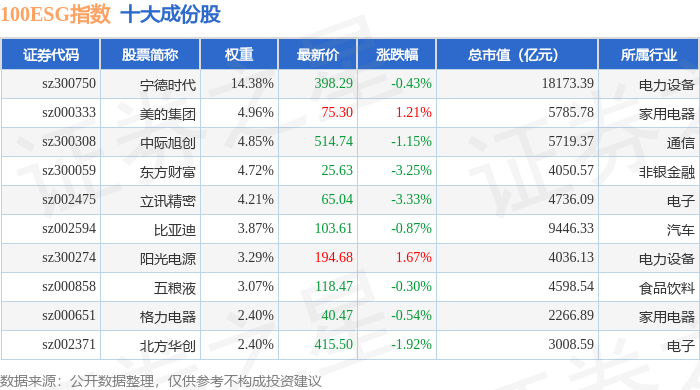 资金流向方面,100ESG(970027)指数成份股当日主力资金净流出合计156.02亿元,游资资金净流入合计49.28亿元,散户资金净流入合计106.74亿元。成份股资金流向详情见下表: