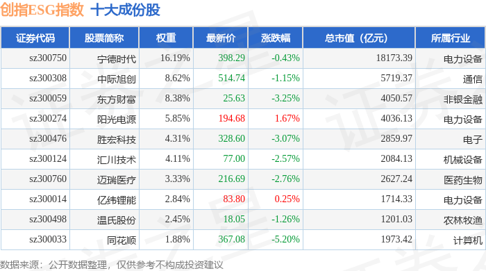 证券之星消息,10月30日,创指ESG(970028)指数报收于3385.86点,跌1.46%,成交2231.45亿元,换手率3.54%。当日该指数成份股中,上涨的有19家,天华新能以14.69%的涨幅领涨,下跌的有60家,天孚通信以11.56%的跌幅领跌。