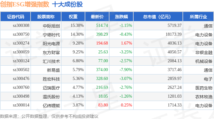 创指ESG增强(970034)指数十大成份股详情如下: