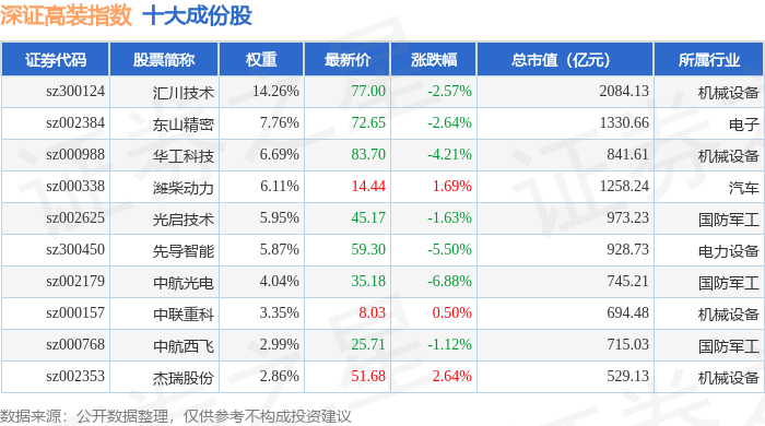 证券之星消息,10月30日,深证高装(970037)指数报收于2903.78点,跌1.92%,成交613.62亿元,换手率3.53%。当日该指数成份股中,上涨的有12家,新雷能以11.97%的涨幅领涨,下跌的有38家,中航光电以6.88%的跌幅领跌。