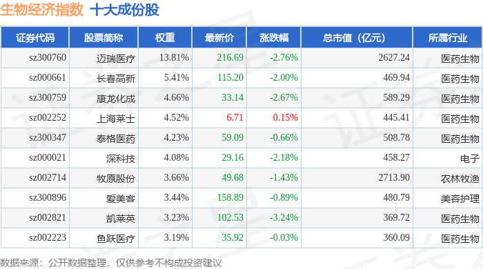证券之星消息,10月30日,生物经济(970038)指数报收于2262.03点,跌1.58%,成交236.8亿元,换手率1.45%。当日该指数成份股中,上涨的有6家,登海种业以0.74%的涨幅领涨,下跌的有43家,大博医疗以7.2%的跌幅领跌。
