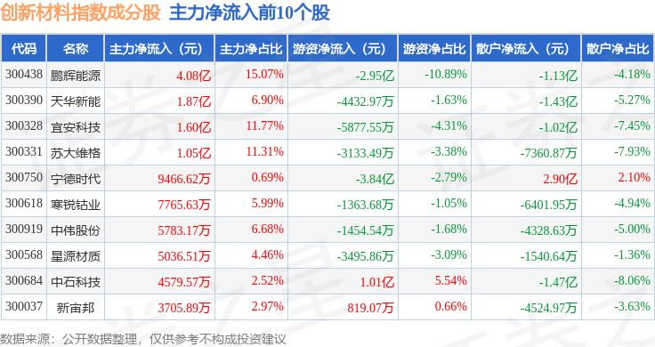 资金流向方面,创新材料(970039)指数成份股当日主力资金净流出合计12.16亿元,游资资金净流入合计1.35亿元,散户资金净流入合计10.81亿元。成份股资金流向详情见下表: