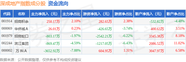 资金流向方面,深成地产(971001)指数成份股当日主力资金净流出合计5049.37万元,游资资金净流出合计3298.31万元,散户资金净流入合计8347.69万元。成份股资金流向详情见下表: