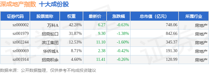 证券之星消息,10月30日,深成地产(971001)指数报收于481.26点,跌0.96%,成交12.94亿元,换手率0.67%。当日该指数成份股中,下跌的有5家,滨江集团以1.6%的跌幅领跌。