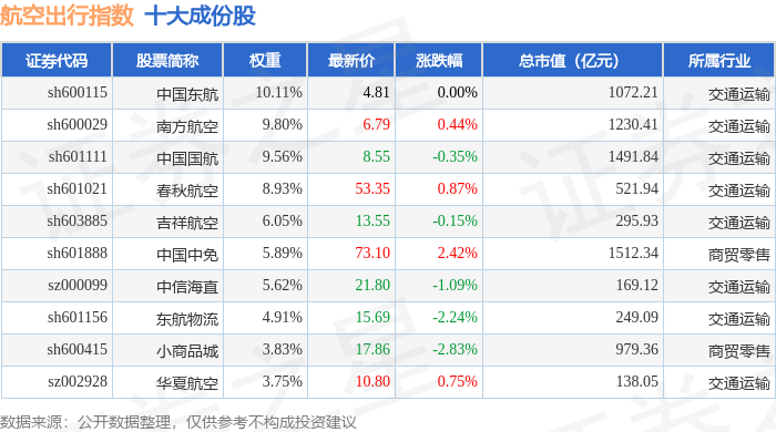 证券之星消息,10月30日,航空出行(980059)指数报收于1535.76点,跌0.38%,成交251.51亿元,换手率2.07%。当日该指数成份股中,上涨的有11家,兰生股份以2.8%的涨幅领涨,下跌的有67家,盈新发展以9.21%的跌幅领跌。