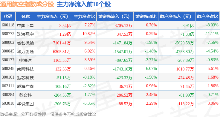 资金流向方面,通用航空(980076)指数成份股当日主力资金净流出合计9.58亿元,游资资金净流入合计5.43亿元,散户资金净流入合计4.15亿元。成份股资金流向详情见下表: