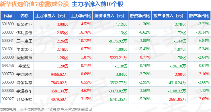 资金流向方面,新华优选价值50(989004)指数成份股当日主力资金净流出合计171.06亿元,游资资金净流入合计63.06亿元,散户资金净流入合计108.0亿元。成份股资金流向详情见下表: