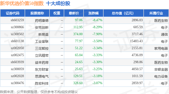 证券之星消息,10月30日,新华优选价值50(989004)指数报收于2242.86点,跌1.28%,成交2822.92亿元,换手率1.49%。当日该指数成份股中,上涨的有18家,宇通客车以5.54%的涨幅领涨,下跌的有32家,药明康德以8.47%的跌幅领跌。