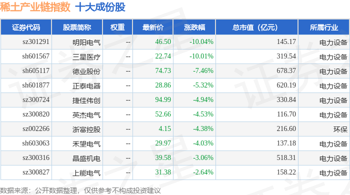 证券之星消息,10月30日,稀土产业链(989013)指数报收于3864.43点,涨0.14%,成交1384.41亿元,换手率3.34%。当日该指数成份股中,上涨的有18家,永兴材料以10.01%的涨幅领涨,下跌的有32家,明阳电气以10.04%的跌幅领跌。