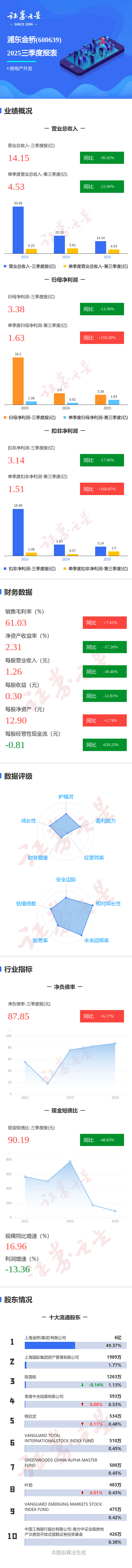 证券之星消息,浦东金桥2025年三季报显示,前三季度公司主营收入14.15亿元,同比下降30.46%;归母净利润3.38亿元,同比下降13.36%;扣非净利润3.14亿元,同比下降17.97%;其中2025年第三季度,公司单季度主营收入4.53亿元,同比下降22.0%;单季度归母净利润1.63亿元,同比上升159.29%;单季度扣非净利润1.51亿元,同比上升160.88%;负债率62.62%,投资收益3971.84万元,财务费用2.8亿元,毛利率61.03%。