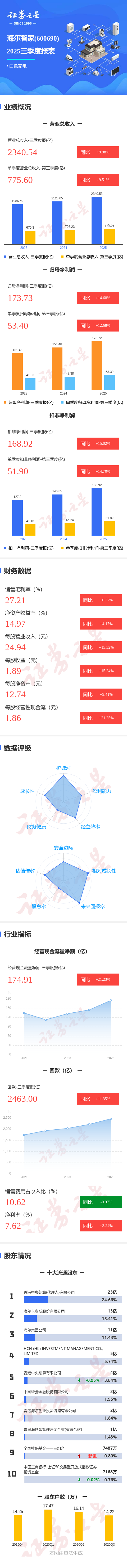 证券之星消息,海尔智家2025年三季报显示,前三季度公司主营收入2340.54亿元,同比上升9.98%;归母净利润173.73亿元,同比上升14.68%;扣非净利润168.92亿元,同比上升15.03%;其中2025年第三季度,公司单季度主营收入775.6亿元,同比上升9.51%;单季度归母净利润53.4亿元,同比上升12.69%;单季度扣非净利润51.9亿元,同比上升14.7%;负债率56.48%,投资收益12.73亿元,财务费用-2.61亿元,毛利率27.21%。