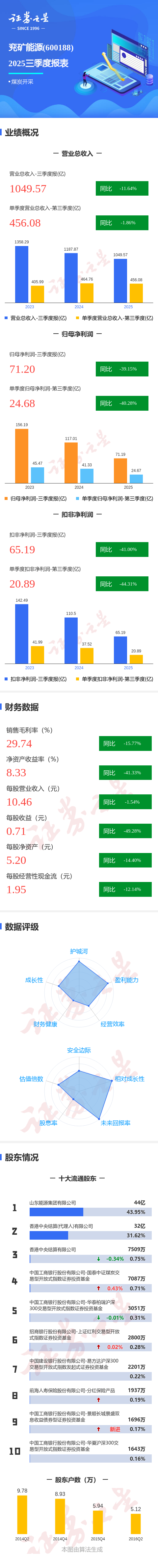 证券之星消息,兖矿能源2025年三季报显示,前三季度公司主营收入1049.57亿元,同比下降11.64%;归母净利润71.2亿元,同比下降39.15%;扣非净利润65.19亿元,同比下降41.01%;其中2025年第三季度,公司单季度主营收入456.08亿元,同比下降1.87%;单季度归母净利润24.68亿元,同比下降40.29%;单季度扣非净利润20.89亿元,同比下降44.32%;负债率66.91%,投资收益17.69亿元,财务费用32.1亿元,毛利率29.74%。