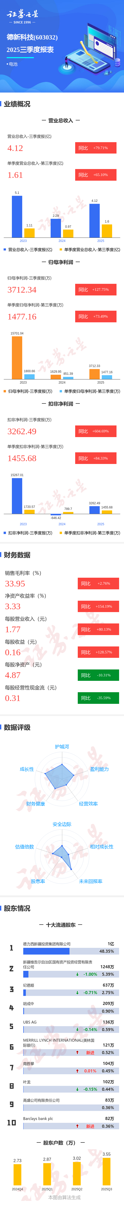 证券之星消息,德新科技2025年三季报显示,前三季度公司主营收入4.12亿元,同比上升79.72%;归母净利润3712.34万元,同比上升127.76%;扣非净利润3262.49万元,同比上升604.7%;其中2025年第三季度,公司单季度主营收入1.61亿元,同比上升65.1%;单季度归母净利润1477.16万元,同比上升73.5%;单季度扣非净利润1455.68万元,同比上升84.33%;负债率24.44%,投资收益173.65万元,财务费用566.56万元,毛利率33.95%。