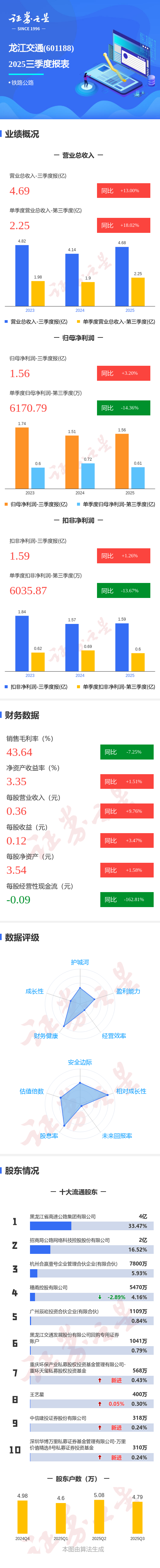 证券之星消息,龙江交通2025年三季报显示,前三季度公司主营收入4.69亿元,同比上升13.0%;归母净利润1.56亿元,同比上升3.21%;扣非净利润1.59亿元,同比上升1.27%;其中2025年第三季度,公司单季度主营收入2.25亿元,同比上升18.02%;单季度归母净利润6170.79万元,同比下降14.36%;单季度扣非净利润6035.87万元,同比下降13.68%;负债率9.7%,投资收益6460.02万元,财务费用-460.38万元,毛利率43.64%。
