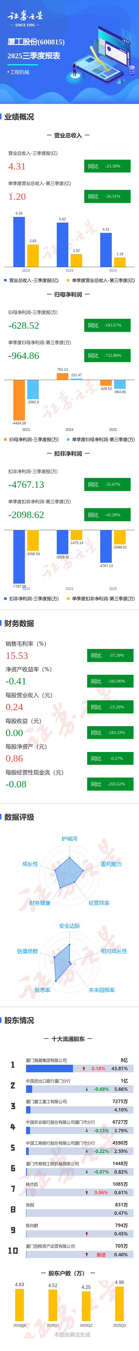 证券之星消息,厦工股份2025年三季报显示,前三季度公司主营收入4.31亿元,同比下降23.3%;归母净利润-628.52万元,同比下降183.68%;扣非净利润-4767.13万元,同比下降35.07%;其中2025年第三季度,公司单季度主营收入1.2亿元,同比下降26.32%;单季度归母净利润-964.86万元,同比下降732.81%;单季度扣非净利润-2098.62万元,同比下降42.27%;负债率23.81%,投资收益2568.48万元,财务费用-275.65万元,毛利率15.53%。