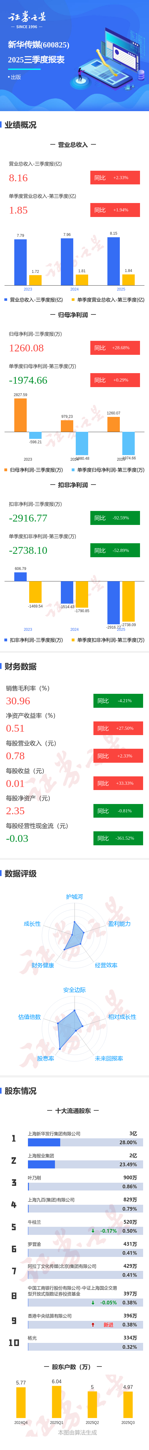 证券之星消息,新华传媒2025年三季报显示,前三季度公司主营收入8.16亿元,同比上升2.33%;归母净利润1260.08万元,同比上升28.68%;扣非净利润-2916.77万元,同比下降92.6%;其中2025年第三季度,公司单季度主营收入1.85亿元,同比上升1.95%;单季度归母净利润-1974.66万元,同比上升0.29%;单季度扣非净利润-2738.1万元,同比下降52.89%;负债率36.73%,投资收益595.83万元,财务费用-907.77万元,毛利率30.96%。