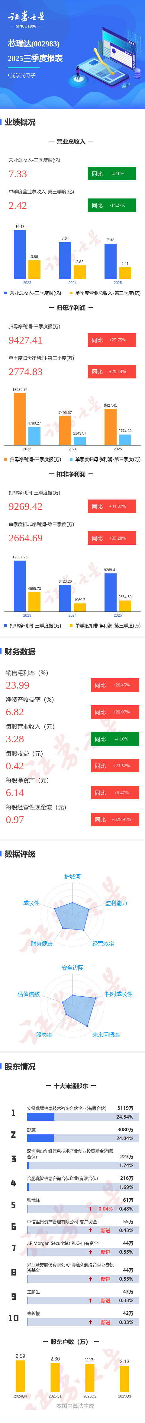 证券之星消息,芯瑞达2025年三季报显示,前三季度公司主营收入7.33亿元,同比下降4.11%;归母净利润9427.41万元,同比上升25.75%;扣非净利润9269.42万元,同比上升44.38%;其中2025年第三季度,公司单季度主营收入2.42亿元,同比下降14.38%;单季度归母净利润2774.83万元,同比上升29.45%;单季度扣非净利润2664.69万元,同比上升35.28%;负债率27.82%,投资收益-10.6万元,财务费用24.47万元,毛利率23.99%。