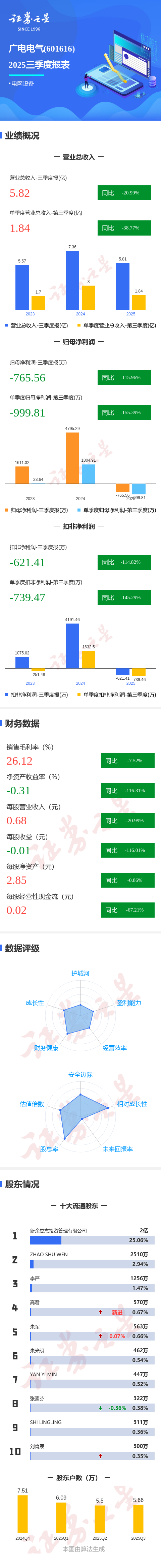 证券之星消息,广电电气2025年三季报显示,前三季度公司主营收入5.82亿元,同比下降21.0%;归母净利润-765.56万元,同比下降115.96%;扣非净利润-621.41万元,同比下降114.83%;其中2025年第三季度,公司单季度主营收入1.84亿元,同比下降38.78%;单季度归母净利润-999.81万元,同比下降155.39%;单季度扣非净利润-739.47万元,同比下降145.3%;负债率14.95%,投资收益915.48万元,财务费用-1178.13万元,毛利率26.12%。