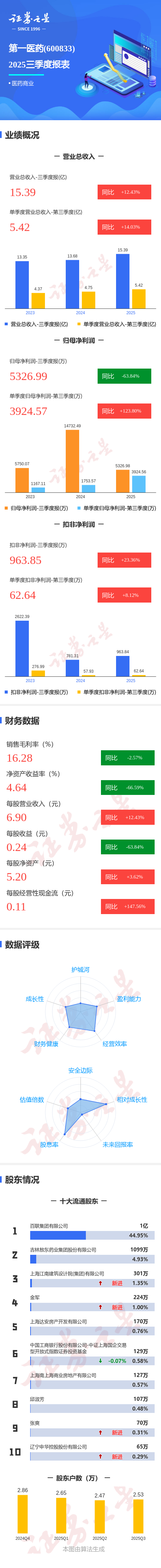 证券之星消息,第一医药2025年三季报显示,前三季度公司主营收入15.39亿元,同比上升12.43%;归母净利润5326.99万元,同比下降63.84%;扣非净利润963.85万元,同比上升23.36%;其中2025年第三季度,公司单季度主营收入5.42亿元,同比上升14.04%;单季度归母净利润3924.57万元,同比上升123.8%;单季度扣非净利润62.64万元,同比上升8.12%;负债率42.37%,投资收益895.87万元,财务费用-620.03万元,毛利率16.28%。