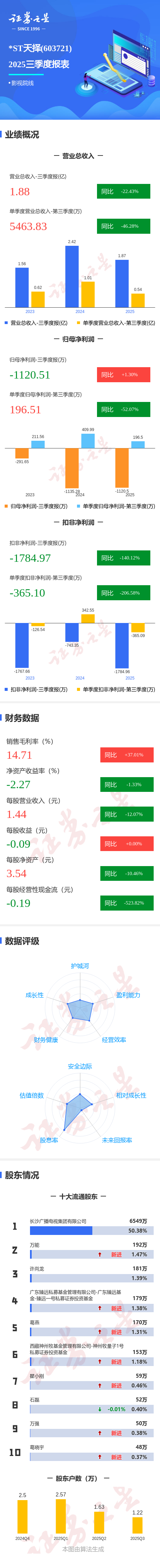 证券之星消息,*ST天择2025年三季报显示,前三季度公司主营收入1.88亿元,同比下降22.43%;归母净利润-1120.51万元,同比上升1.3%;扣非净利润-1784.97万元,同比下降140.12%;其中2025年第三季度,公司单季度主营收入5463.83万元,同比下降46.29%;单季度归母净利润196.51万元,同比下降52.07%;单季度扣非净利润-365.1万元,同比下降206.58%;负债率39.4%,投资收益622.67万元,财务费用414.66万元,毛利率14.71%。