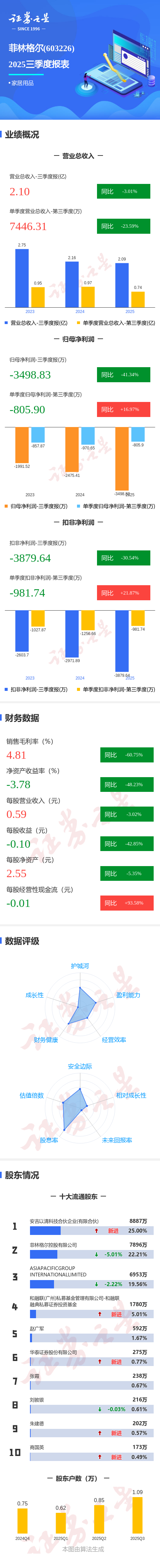证券之星消息,菲林格尔2025年三季报显示,前三季度公司主营收入2.1亿元,同比下降3.02%;归母净利润-3498.83万元,同比下降41.34%;扣非净利润-3879.64万元,同比下降30.54%;其中2025年第三季度,公司单季度主营收入7446.31万元,同比下降23.6%;单季度归母净利润-805.9万元,同比上升16.97%;单季度扣非净利润-981.74万元,同比上升21.88%;负债率28.14%,投资收益9.71万元,财务费用-448.92万元,毛利率4.81%。
