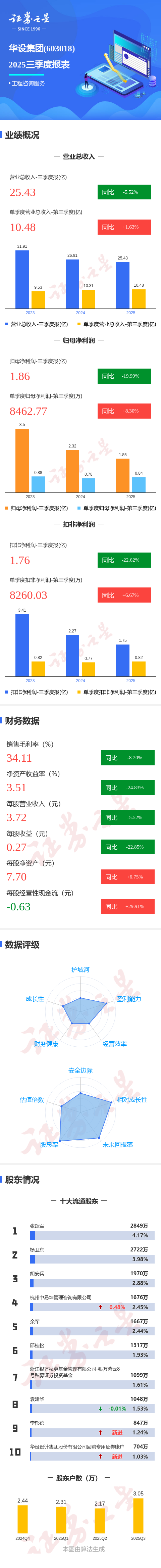 证券之星消息,华设集团2025年三季报显示,前三季度公司主营收入25.43亿元,同比下降5.52%;归母净利润1.86亿元,同比下降19.99%;扣非净利润1.76亿元,同比下降22.62%;其中2025年第三季度,公司单季度主营收入10.48亿元,同比上升1.64%;单季度归母净利润8462.77万元,同比上升8.3%;单季度扣非净利润8260.03万元,同比上升6.68%;负债率56.62%,投资收益-66.0万元,财务费用576.61万元,毛利率34.11%。