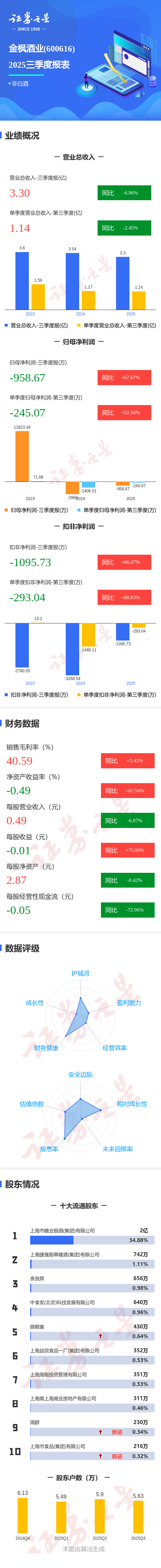 证券之星消息,金枫酒业2025年三季报显示,前三季度公司主营收入3.3亿元,同比下降6.86%;归母净利润-958.67万元,同比上升67.68%;扣非净利润-1095.73万元,同比上升66.48%;其中2025年第三季度,公司单季度主营收入1.14亿元,同比下降2.46%;单季度归母净利润-245.07万元,同比上升82.57%;单季度扣非净利润-293.04万元,同比上升80.04%;负债率11.06%,财务费用-1014.53万元,毛利率40.59%。
