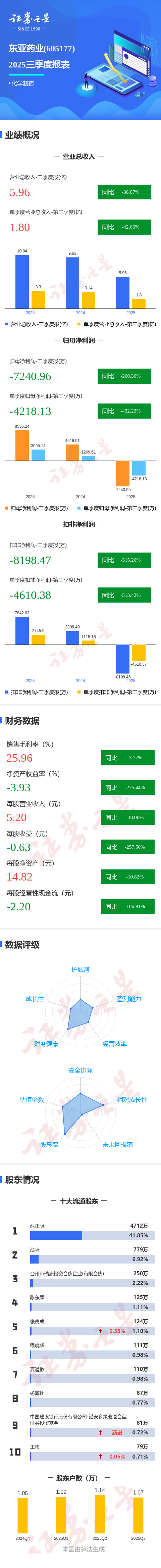 证券之星消息,东亚药业2025年三季报显示,前三季度公司主营收入5.96亿元,同比下降38.08%;归母净利润-7240.96万元,同比下降260.31%;扣非净利润-8198.47万元,同比下降315.27%;其中2025年第三季度,公司单季度主营收入1.8亿元,同比下降42.67%;单季度归母净利润-4218.13万元,同比下降432.24%;单季度扣非净利润-4610.38万元,同比下降513.42%;负债率46.46%,投资收益229.21万元,财务费用621.01万元,毛利率25.96%。