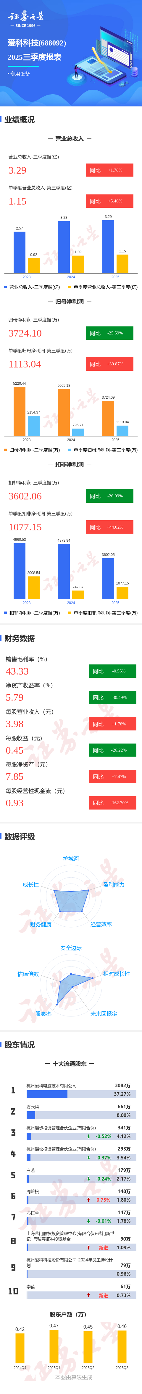 证券之星消息,爱科科技2025年三季报显示,前三季度公司主营收入3.29亿元,同比上升1.79%;归母净利润3724.1万元,同比下降25.6%;扣非净利润3602.06万元,同比下降26.1%;其中2025年第三季度,公司单季度主营收入1.15亿元,同比上升5.47%;单季度归母净利润1113.04万元,同比上升39.88%;单季度扣非净利润1077.15万元,同比上升44.03%;负债率21.79%,投资收益109.95万元,财务费用-609.19万元,毛利率43.33%。