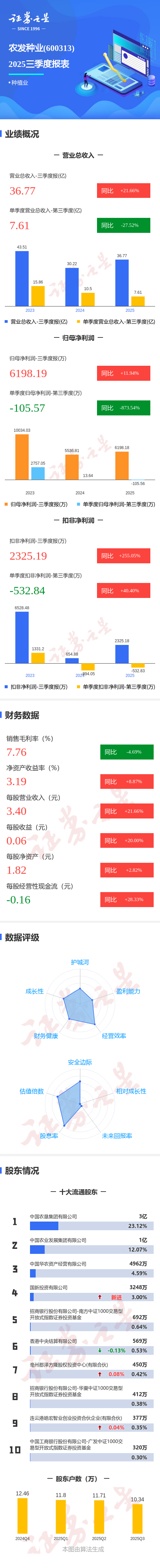 证券之星消息,农发种业2025年三季报显示,前三季度公司主营收入36.77亿元,同比上升21.66%;归母净利润6198.19万元,同比上升11.95%;扣非净利润2325.19万元,同比上升255.05%;其中2025年第三季度,公司单季度主营收入7.61亿元,同比下降27.52%;单季度归母净利润-105.57万元,同比下降873.54%;单季度扣非净利润-532.84万元,同比上升40.4%;负债率40.65%,投资收益432.95万元,财务费用858.45万元,毛利率7.76%。