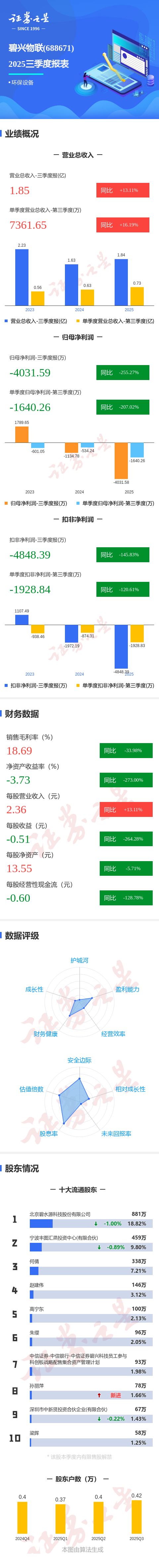 证券之星消息,碧兴物联2025年三季报显示,前三季度公司主营收入1.85亿元,同比上升13.11%;归母净利润-4031.59万元,同比下降255.27%;扣非净利润-4848.39万元,同比下降145.84%;其中2025年第三季度,公司单季度主营收入7361.65万元,同比上升16.2%;单季度归母净利润-1640.26万元,同比下降207.02%;单季度扣非净利润-1928.84万元,同比下降120.61%;负债率20.01%,投资收益557.75万元,财务费用-239.73万元,毛利率18.69%。
