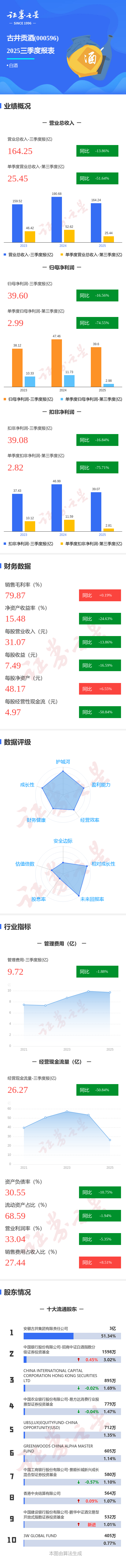 证券之星消息,古井贡酒2025年三季报显示,前三季度公司主营收入164.25亿元,同比下降13.87%;归母净利润39.6亿元,同比下降16.57%;扣非净利润39.08亿元,同比下降16.85%;其中2025年第三季度,公司单季度主营收入25.45亿元,同比下降51.65%;单季度归母净利润2.99亿元,同比下降74.56%;单季度扣非净利润2.82亿元,同比下降75.71%;负债率30.55%,投资收益-2087.83万元,财务费用-4.33亿元,毛利率79.87%。
