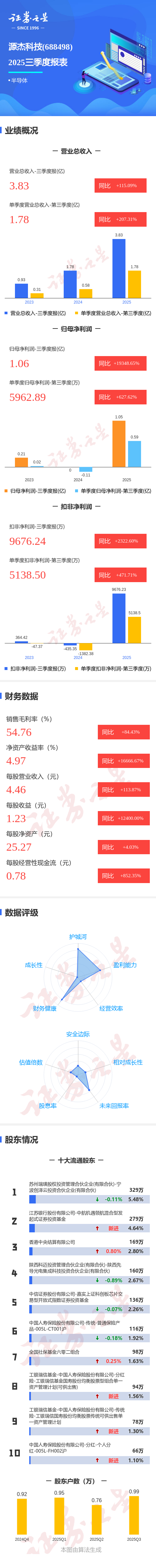 证券之星消息,源杰科技2025年三季报显示,前三季度公司主营收入3.83亿元,同比上升115.09%;归母净利润1.06亿元,同比上升19348.65%;扣非净利润9676.24万元,同比上升2322.6%;其中2025年第三季度,公司单季度主营收入1.78亿元,同比上升207.31%;单季度归母净利润5962.89万元,同比上升627.62%;单季度扣非净利润5138.5万元,同比上升471.71%;负债率9.08%,投资收益-111.89万元,财务费用-1071.19万元,毛利率54.76%。