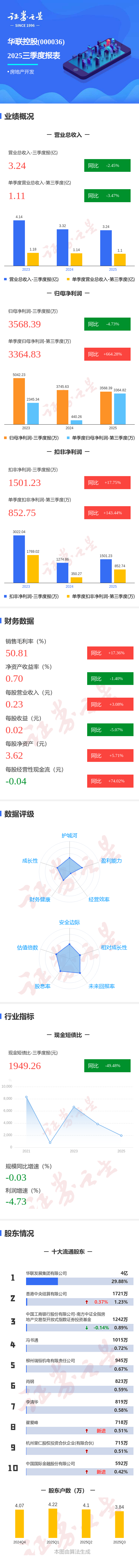 证券之星消息,华联控股2025年三季报显示,前三季度公司主营收入3.24亿元,同比下降2.45%;归母净利润3568.39万元,同比下降4.73%;扣非净利润1501.23万元,同比上升17.76%;其中2025年第三季度,公司单季度主营收入1.11亿元,同比下降3.47%;单季度归母净利润3364.83万元,同比上升664.28%;单季度扣非净利润852.75万元,同比上升143.45%;负债率22.09%,投资收益1353.64万元,财务费用1011.75万元,毛利率50.81%。