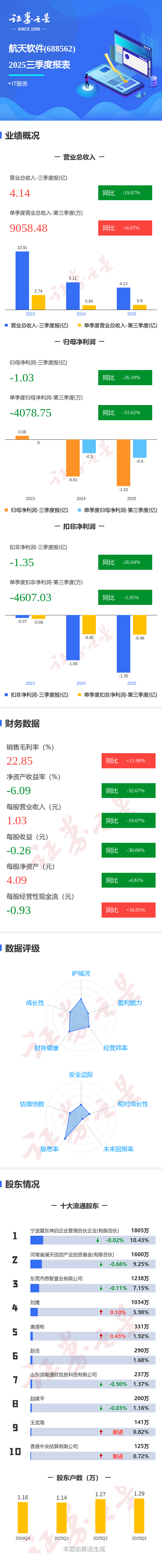 证券之星消息,航天软件2025年三季报显示,前三季度公司主营收入4.14亿元,同比下降19.07%;归母净利润-1.03亿元,同比下降26.11%;扣非净利润-1.35亿元,同比下降26.65%;其中2025年第三季度,公司单季度主营收入9058.48万元,同比上升6.67%;单季度归母净利润-4078.75万元,同比下降33.62%;单季度扣非净利润-4607.03万元,同比下降1.06%;负债率45.79%,投资收益265.63万元,财务费用-680.04万元,毛利率22.85%。