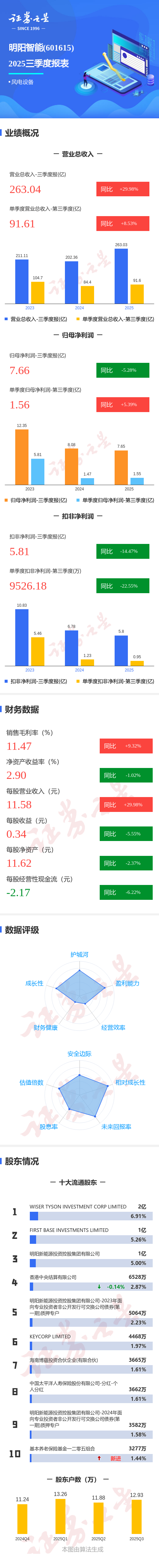 证券之星消息,明阳智能2025年三季报显示,前三季度公司主营收入263.04亿元,同比上升29.98%;归母净利润7.66亿元,同比下降5.29%;扣非净利润5.81亿元,同比下降14.47%;其中2025年第三季度,公司单季度主营收入91.61亿元,同比上升8.53%;单季度归母净利润1.56亿元,同比上升5.39%;单季度扣非净利润9526.18万元,同比下降22.56%;负债率69.98%,投资收益2.35亿元,财务费用3.69亿元,毛利率11.47%。