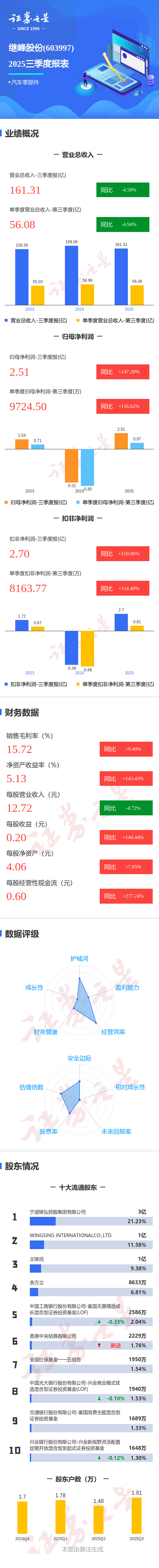 证券之星消息,继峰股份2025年三季报显示,前三季度公司主营收入161.31亿元,同比下降4.58%;归母净利润2.51亿元,同比上升147.21%;扣非净利润2.7亿元,同比上升150.06%;其中2025年第三季度,公司单季度主营收入56.08亿元,同比下降4.94%;单季度归母净利润9724.5万元,同比上升116.62%;单季度扣非净利润8163.77万元,同比上升114.41%;负债率75.63%,投资收益-3215.93万元,财务费用1.97亿元,毛利率15.72%。