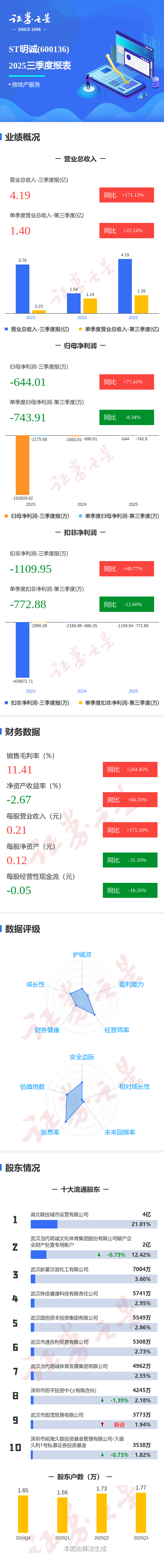 证券之星消息,ST明诚2025年三季报显示,前三季度公司主营收入4.19亿元,同比上升171.13%;归母净利润-644.01万元,同比上升77.41%;扣非净利润-1109.95万元,同比上升48.78%;其中2025年第三季度,公司单季度主营收入1.4亿元,同比上升22.15%;单季度归母净利润-743.91万元,同比下降8.34%;单季度扣非净利润-772.88万元,同比下降12.61%;负债率68.78%,投资收益41.05万元,财务费用805.45万元,毛利率11.41%。