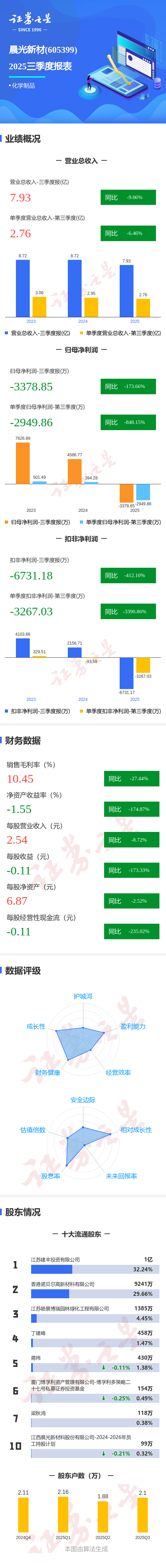 证券之星消息,晨光新材2025年三季报显示,前三季度公司主营收入7.93亿元,同比下降9.06%;归母净利润-3378.85万元,同比下降173.67%;扣非净利润-6731.18万元,同比下降412.1%;其中2025年第三季度,公司单季度主营收入2.76亿元,同比下降6.47%;单季度归母净利润-2949.86万元,同比下降848.15%;单季度扣非净利润-3267.03万元,同比下降3390.87%;负债率34.61%,投资收益335.95万元,财务费用-375.89万元,毛利率10.45%。